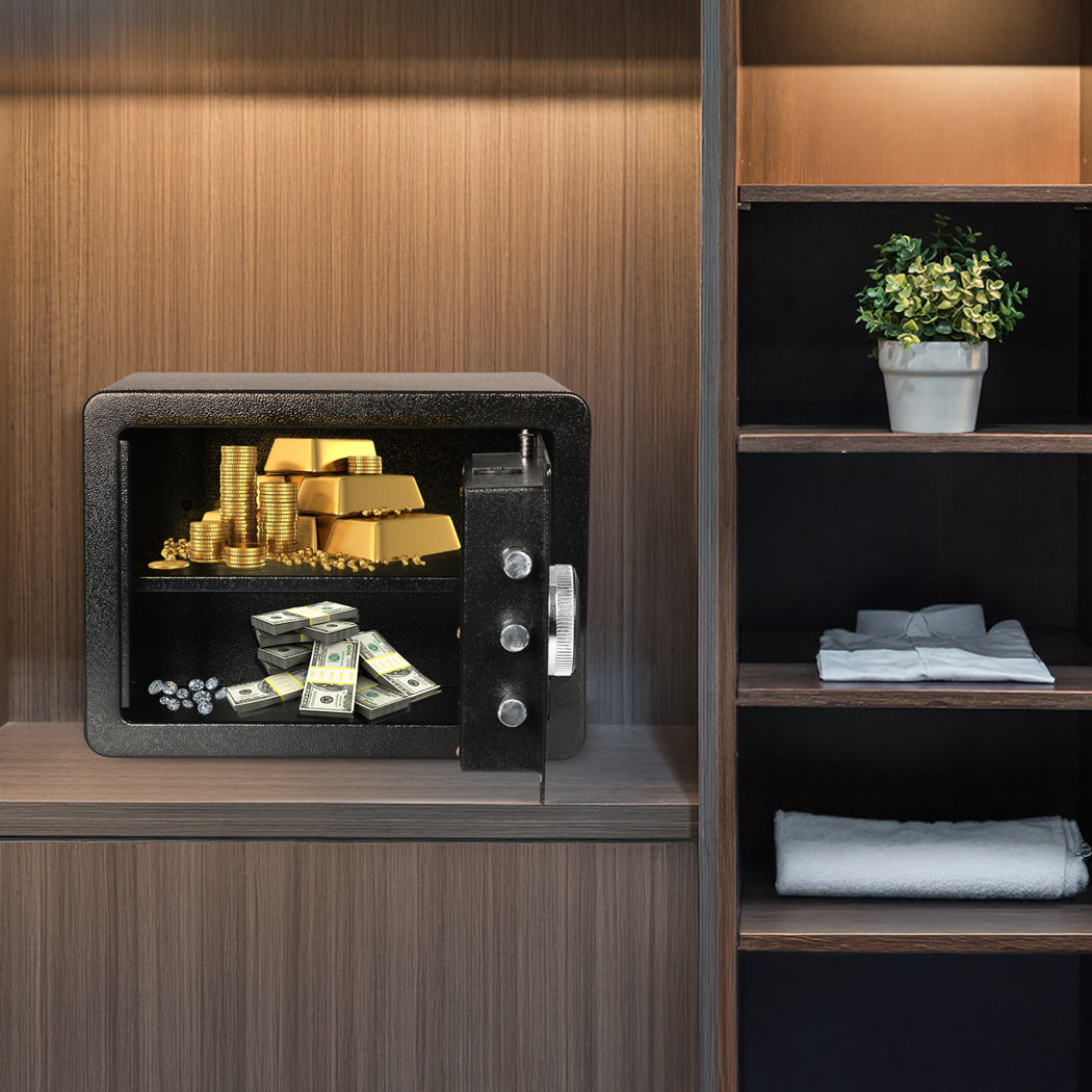 Protect your valuables with this secure digital safe – the perfect safe box for cash, documents, jewelry, and more! Whether you're looking for a small safe to store your money, a gun safe to keep firearms secure, or a fireproof safe to protect important documents from fire damage, this security box has you covered. It features an easy-to-use key safe system and a robust lock box design, making it an ideal choice for home, office, or travel. Keep your peace of mind knowing your most valuable items are locked up tight in this durable, fireproof document box. This money safe is a must-have for anyone who values security and protection – get yours today and experience the ultimate in safe storage!