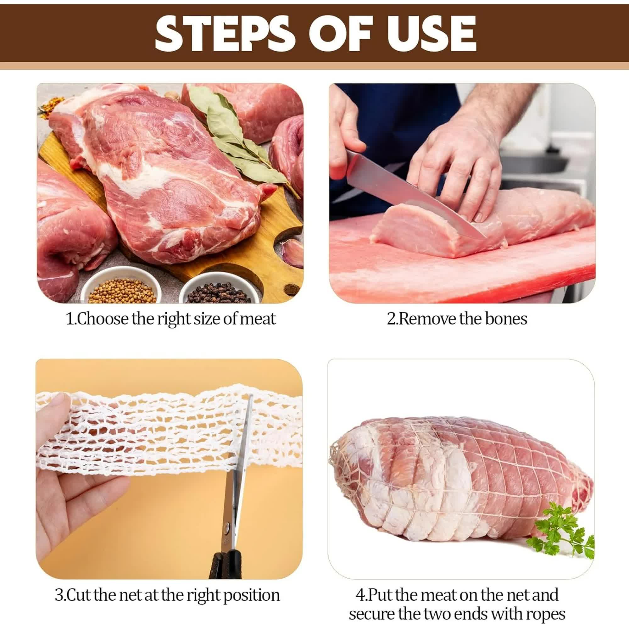 Relyonelasticmeatnettingtosecurearoundyourbeef,pork,andothermeats,roasting,andcuring,sothatthemeatcooksevenlyanddoesnotfallapart.