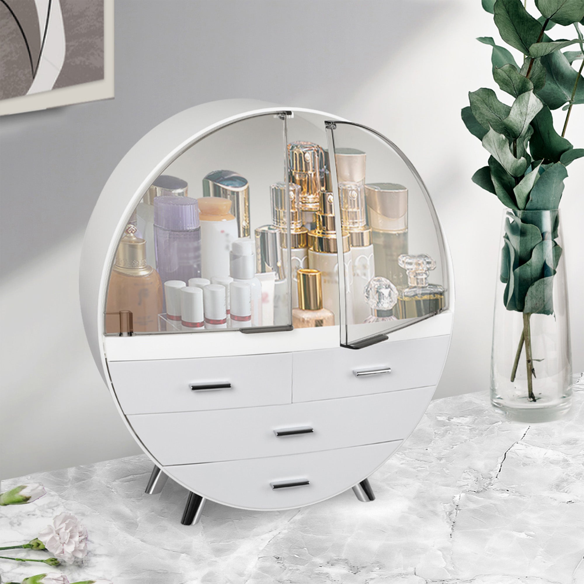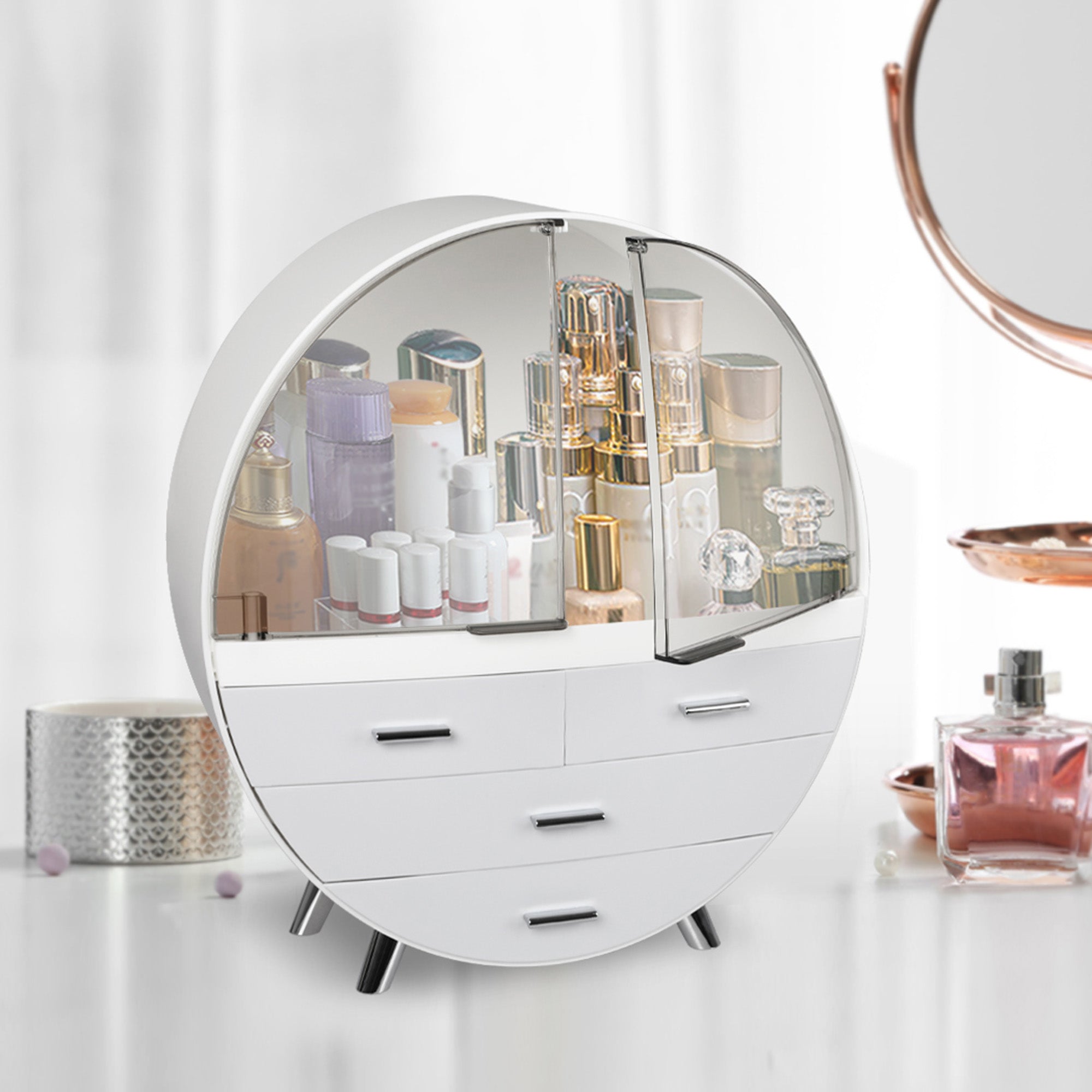 Speed up your morning routine. Grab your makeup case and see everything at a glance. Apply your makeup and hair products. Grab out some tasteful earrings and head out for the board meeting.