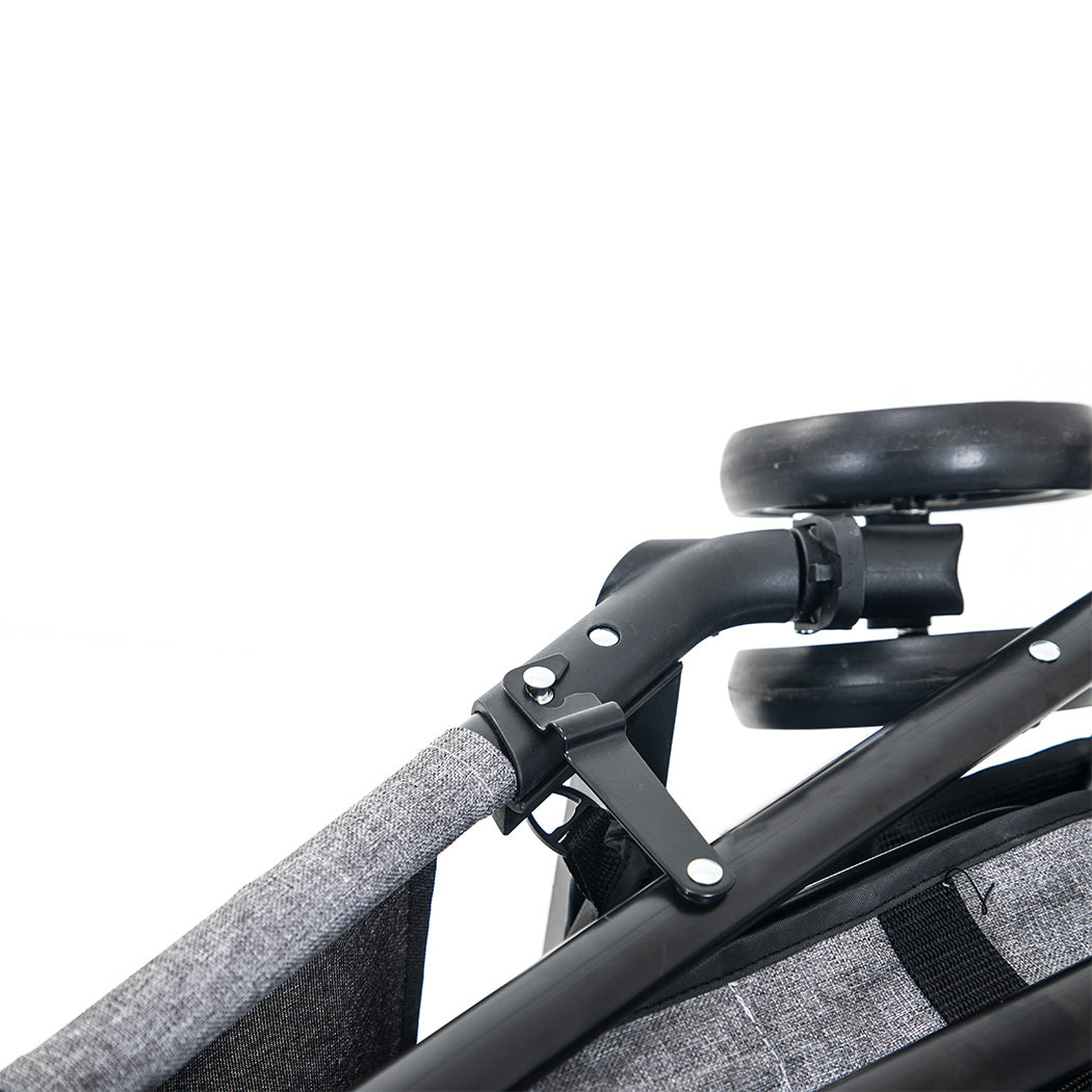 Take your little one for a fun ride with our Pet Stroller. It provides your pet with a safe and secure space to lounge, to enjoy the nature, or to simply be themselves. It comes with a meshed front to give your furry friend a comprehensive view of the surroundings all while reclining in style. If they need fresh air adjust its canopy as you prefer. Great way to socialize your pet with less exposure to risks such as harmful terrain, irregular weather, flying insects, or any other non-friendly pets they might encounter. Going through uneven surface? Not a worry, with its modern spring shock absorption it will ensure a smoother experience. Designed to cushion your pet with right amount of support, pampers them with its soft textures to sway them into a realm of peace and tranquillity. It enables flawless airflow, great visibility, and protection ? all of the necessary features packed in one. Sleek appearance, subtle finish.