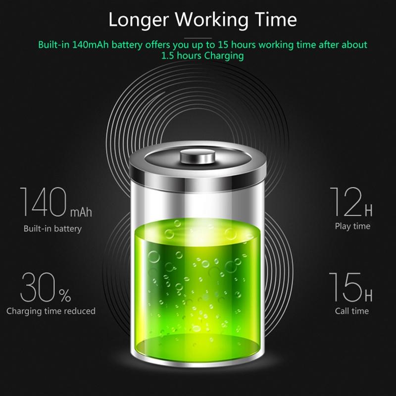 • 140mAh built-in battery with 12 hours of music playback and 15 hours of talk time